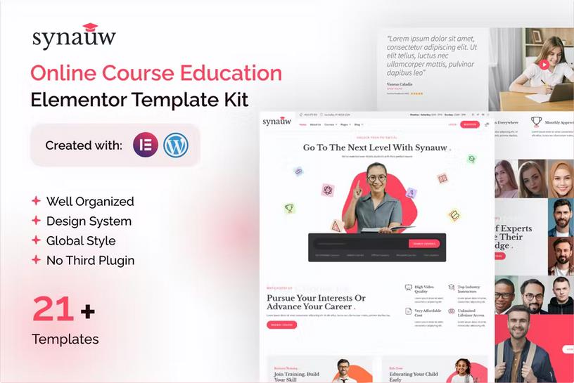 Unlock the full potential of your online learning platform with the Synauw Online Course Education Elementor Template Kit. This expertly crafted kit offers a stunning, professional, and user-friendly design that will captivate your audience and drive student enrollments. With easy drag-and-drop customization powered by Elementor, you can create a beautiful and functional website in hours, not days, showcasing your courses and expertise effectively.