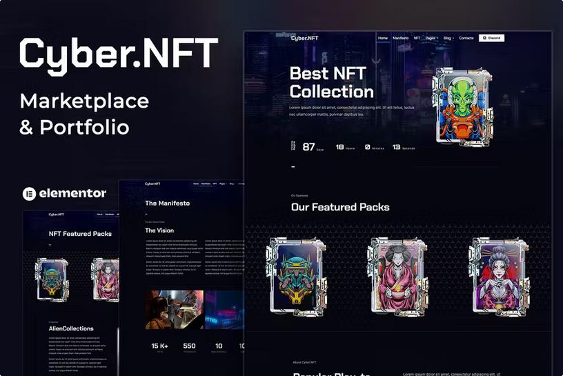 Crafted with precision and optimized for Elementor, this template kit empowers you to establish a professional online presence without the need for extensive coding knowledge. From eye-catching landing pages to detailed item displays and user profiles, Cyber.NFT offers a comprehensive suite of pre-designed sections and pages. Elevate your digital art, build a thriving community, and make a lasting impression in the burgeoning NFT space. Get ready to stand out and monetize your creativity like never before.