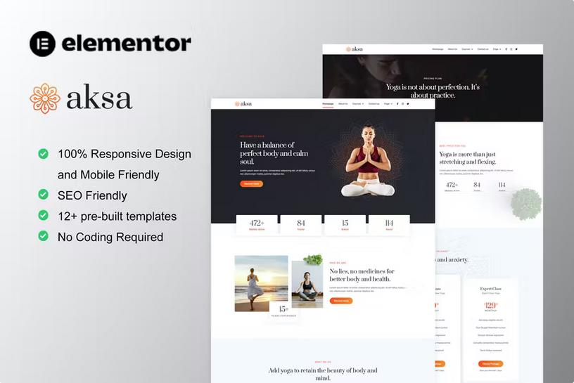 Elevate your yoga business online with the Aksa – Yoga Teacher & Studio Elementor Template Kit, a premium solution designed to showcase your expertise and attract new clients. This meticulously crafted kit provides a seamless and visually stunning platform for yoga instructors, studios, and wellness centers to establish a powerful online presence. With a focus on clean design, intuitive navigation, and user-friendly customization, Aksa empowers you to create a professional website that reflects the tranquility and essence of yoga.
