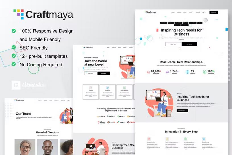 A: Absolutely! CraftMaya is built for Elementor, allowing you to easily customize every aspect of your website. You can change colors, fonts, spacing, and rearrange elements using the drag-and-drop interface to perfectly match your brand identity.Q: Is this template kit compatible with all WordPress themes?