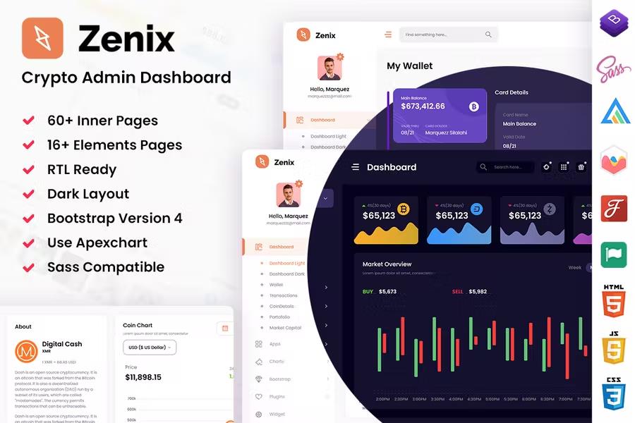 Featuring a sleek, professional design and a wealth of pre-built components, Zenix empowers you to create robust dashboards for cryptocurrency exchanges, wallets, trading platforms, and more. Its clean code structure and extensive documentation make customization a breeze, allowing you to tailor the dashboard to your specific needs and brand identity. Streamline your workflow and deliver an exceptional user experience with this cutting-edge admin template.