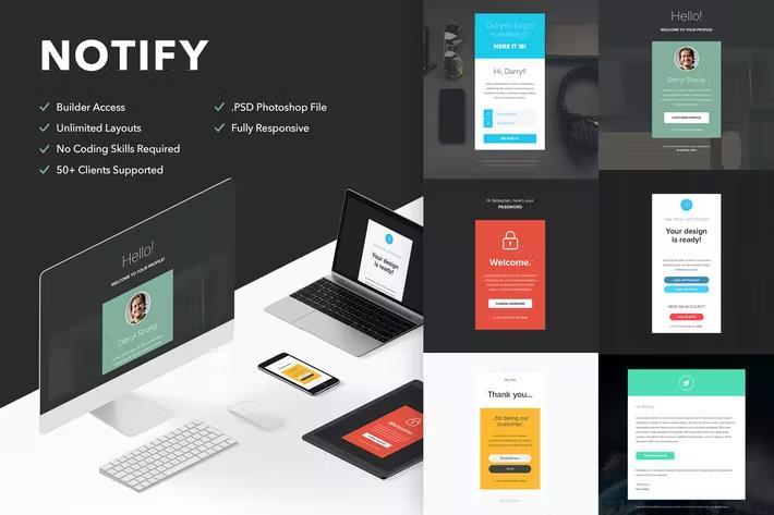 A: Notify includes templates for a wide range of notifications, such as welcome emails, password resets, order confirmations, shipping updates, account verification, and many more. The themebuilder allows for further customization to suit unique needs.Q: Is Notify compatible with all email clients?