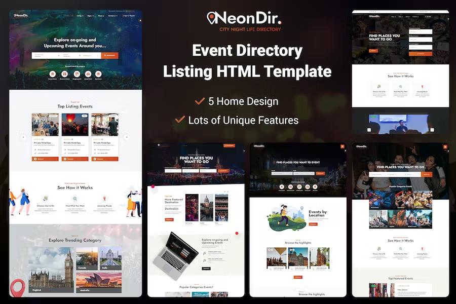 Introducing NeonDir – Event Directory Listing HTML Template, your ultimate solution for creating vibrant and comprehensive event listing websites. This meticulously crafted HTML template is designed to showcase a wide array of events, from local meetups and workshops to large-scale festivals and conferences. With its modern, clean, and eye-catching design, NeonDir ensures your event listings are not only informative but also incredibly engaging for your audience. Built with the latest web technologies, it offers a seamless user experience across all devices, making it easy for visitors to discover, browse, and find events that matter to them.