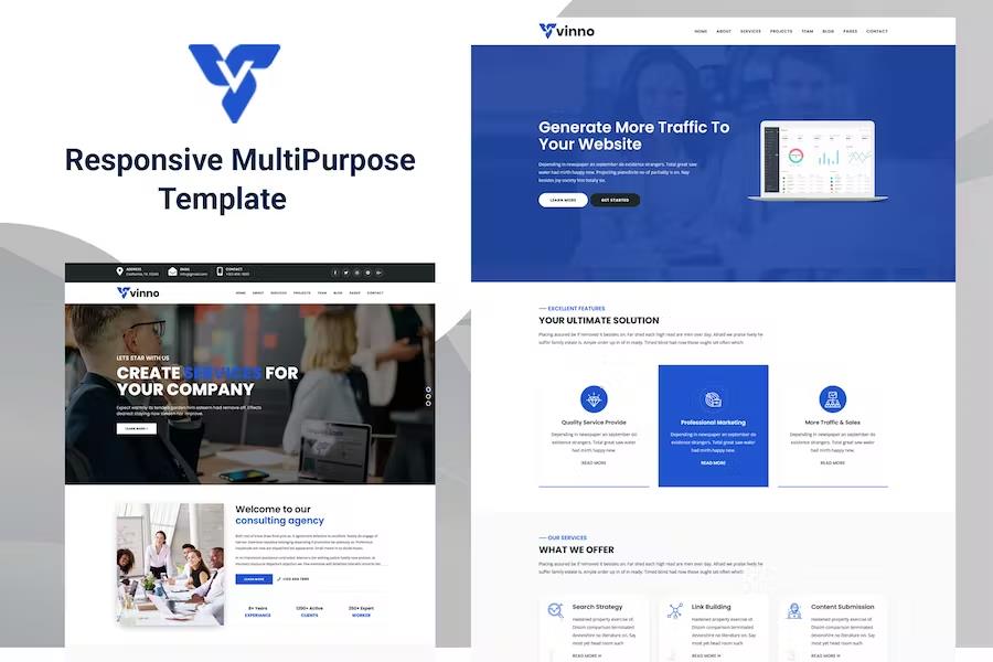 Elevate your online presence with Vinno – Responsive Multi-Purpose HTML5 Template. This expertly designed template offers a powerful, flexible, and visually stunning platform for any project. Harness the benefits of a 100% responsive design, clean code, and a suite of pre-built sections to create a professional website that truly stands out and engages your audience effectively.