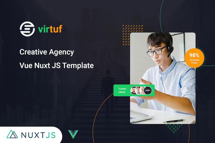 Elevate your online presence with Virtuf, the ultimate Vue JS Website Template using Nuxt JS. Designed for creative agencies and businesses that demand excellence, Virtuf offers a perfect synergy of stunning design, blazing-fast performance, and powerful Nuxt.js features. Showcase your work, impress your clients, and drive growth with a website that truly stands out.