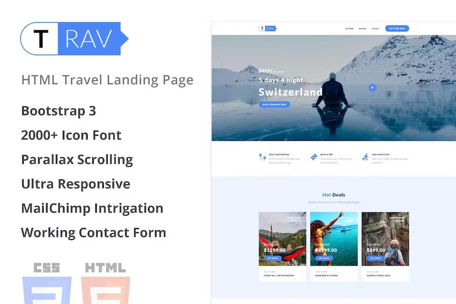 Embark on a journey to captivating online presence with Trav – Travel HTML Landing Page, the ultimate HTML template designed to showcase your travel agency, tour operator, or vacation rental business. This meticulously crafted template offers a visually stunning and user-friendly experience, ensuring your potential clients are drawn into the world of adventure and relaxation from the very first click. Featuring a clean, modern design and an intuitive layout, Trav provides all the essential elements to highlight your services, destinations, and special offers effectively.