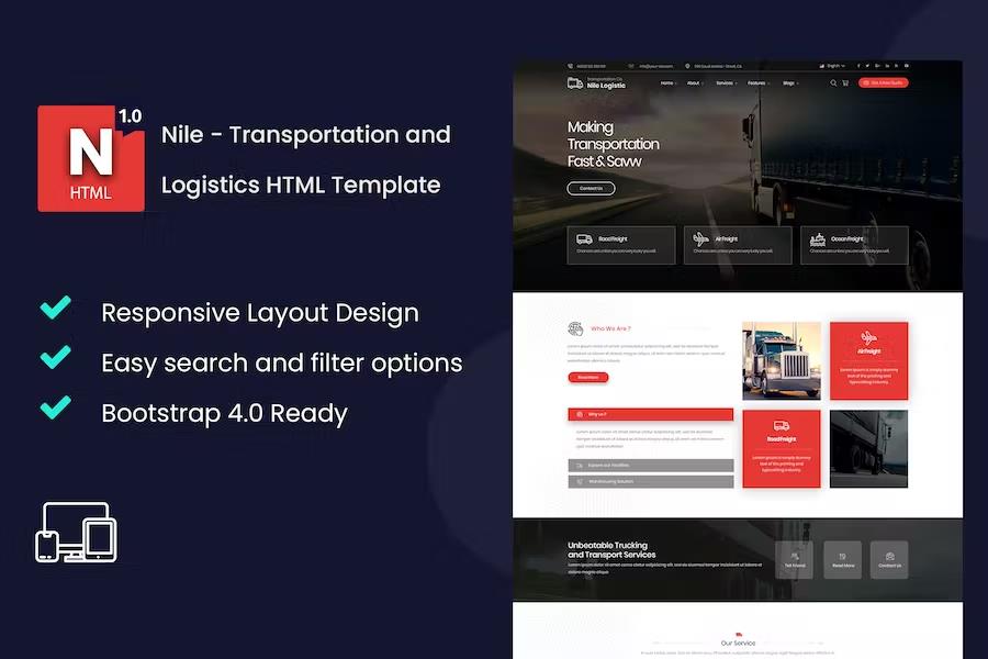 Elevate your transportation and logistics business with Nile – Transportation and Logistics HTML Template. This meticulously crafted template offers a professional, modern, and highly functional online platform designed to impress your clients and streamline your digital operations. With its sleek design, intuitive navigation, and robust feature set, Nile ensures your services are presented with clarity and impact, making it easier than ever to attract new business and build lasting customer relationships.