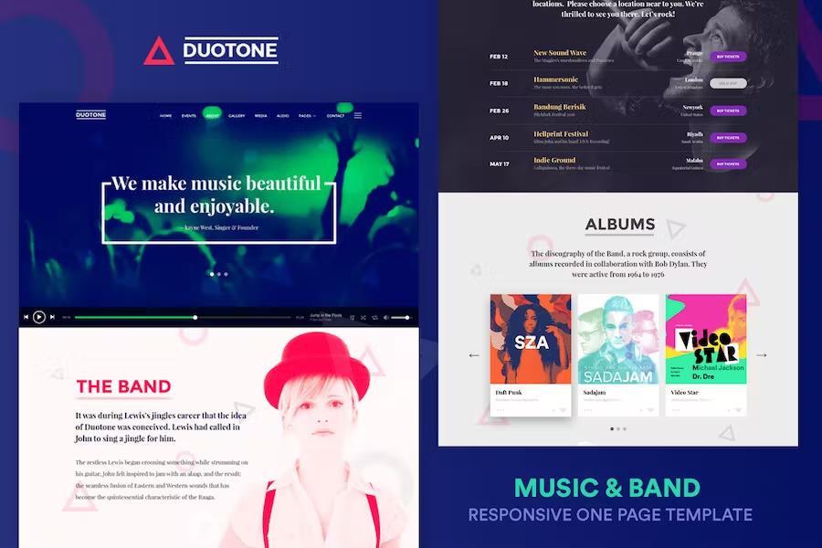 Choosing Duotone means investing in a professional online presence that reflects the quality of your music. Its user-friendly customization, essential features like galleries, event listings, and discography sections, make it the ideal choice for bands and artists looking to stand out. Stop settling for generic websites; embrace a design that’s as dynamic and captivating as your sound.