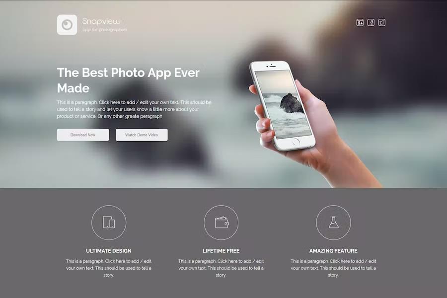 This premium landing page template is built to convert visitors into enthusiastic users. With strategically placed calls-to-action, engaging imagery sections, and clear typography, Snapview guides your audience through your app’s story seamlessly. Whether you’re launching a new product or looking to revitalize your existing app’s online presence, Snapview provides the perfect foundation for a successful digital campaign. Elevate your app’s marketing with a template that speaks volumes about its quality and innovation.