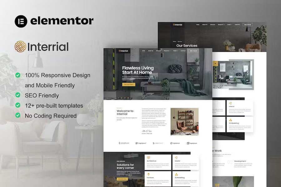 Choosing Interrial means investing in a seamless design experience. Say goodbye to the frustration of complex coding and embrace the intuitive drag-and-drop power of Elementor. This kit is meticulously crafted to save you time and resources, allowing you to focus on what you do best – designing beautiful spaces. Its fully responsive design ensures your work looks impeccable on any device, while its SEO-optimized structure helps you reach a wider audience, giving you a significant competitive edge in the market.