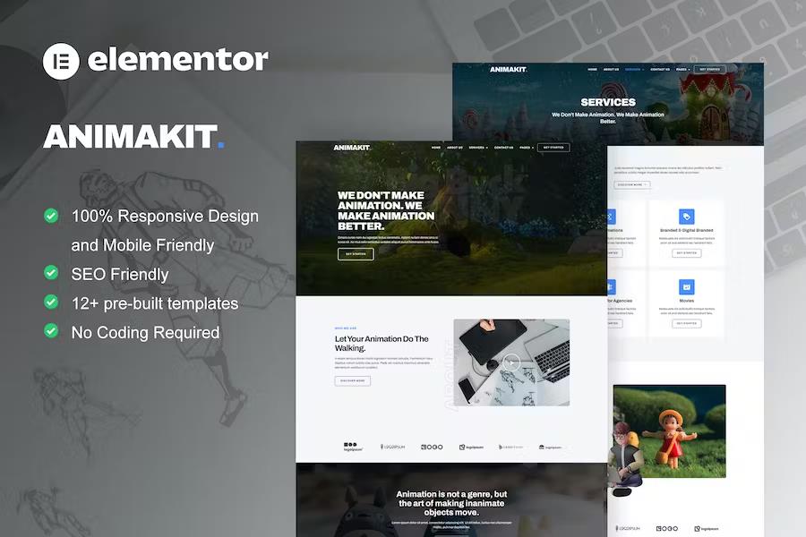 Choosing Animakit means investing in a professional and conversion-focused website without the hefty price tag of custom development. Its pre-built templates and Elementor Pro integration empower you to build a sophisticated online portfolio that truly represents the quality and dynamism of your animation services. Stand out from the competition and make a lasting impression on potential clients with a website that’s as creative as your work.
