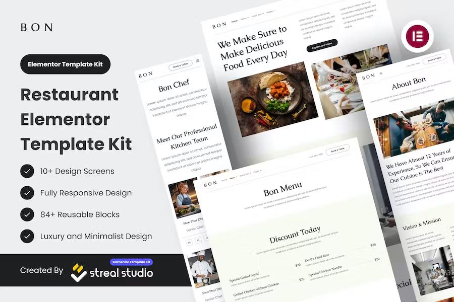 Elevate your restaurant’s online presence with Bon – Restaurant Elementor Template Kit, a meticulously crafted solution designed to showcase your culinary delights and attract more diners. This comprehensive kit offers a stunning collection of pre-designed pages and sections, all fully customizable with Elementor’s intuitive drag-and-drop interface. Whether you’re launching a new eatery, revamping an existing website, or simply want to impress with a professional look, Bon provides everything you need to create a visually appealing and highly functional restaurant website.